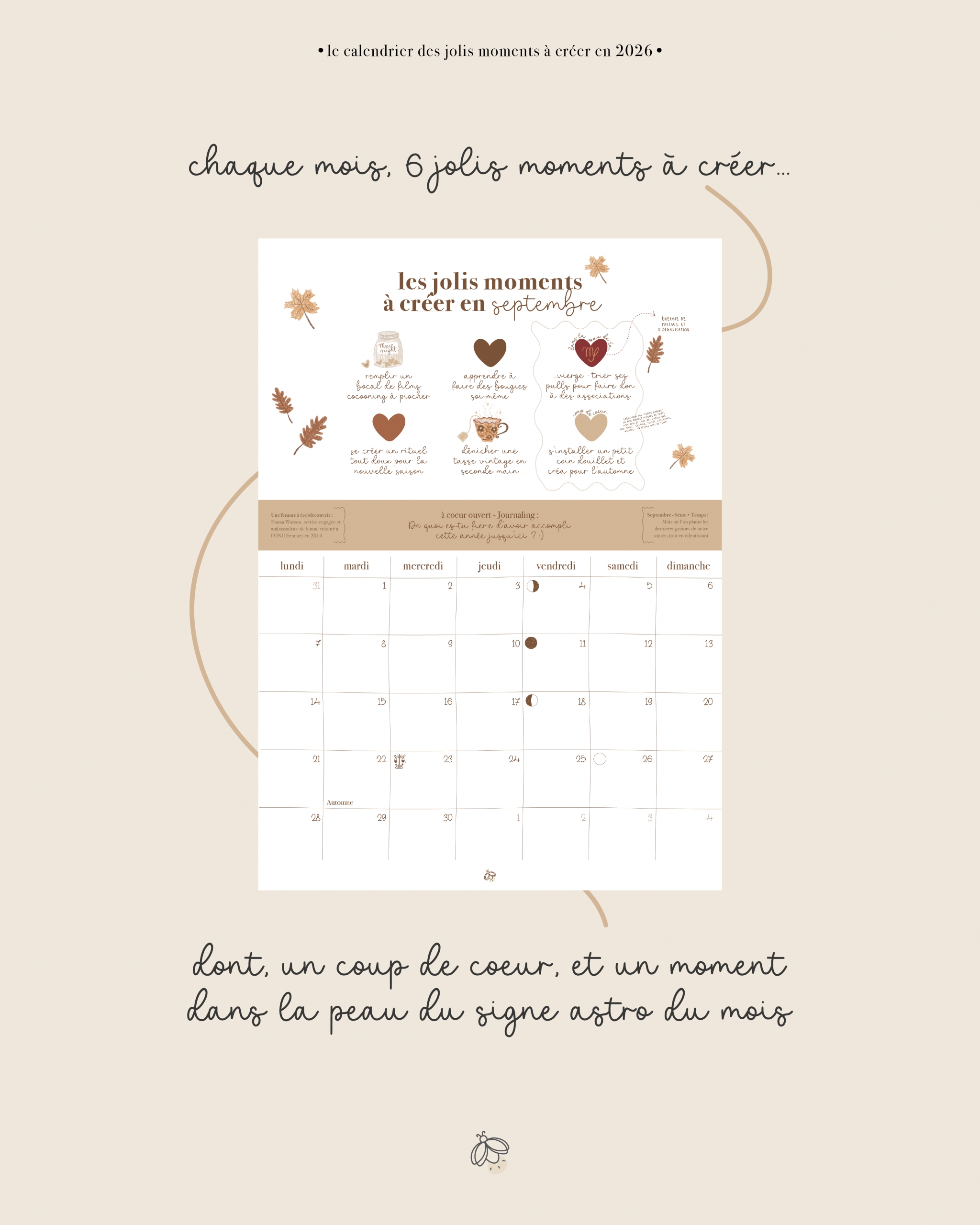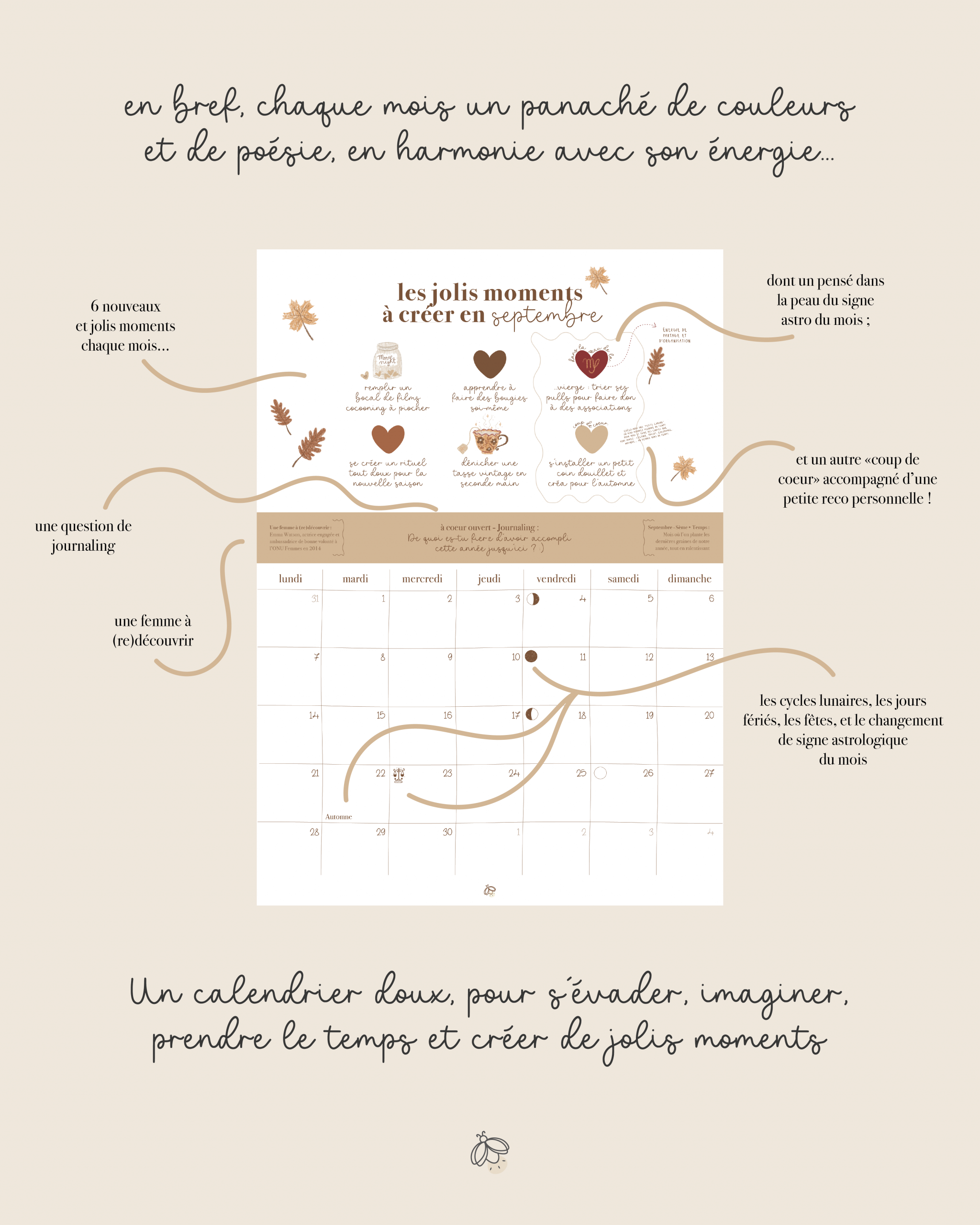 Calendrier illustré et doux, pour une année placée sous le signe des jolis moments, qu’ils soient avec vous-mêmes ou à partager avec ceux et celle que vous aimez. Retrouvez chaque mois des idées de jolis moments à créer pour inviter à savourer chaque saison, chaque mois, chaque journée. Dans l’esprit du slow life, il encourage à ralentir et à profiter de l’instant présent.