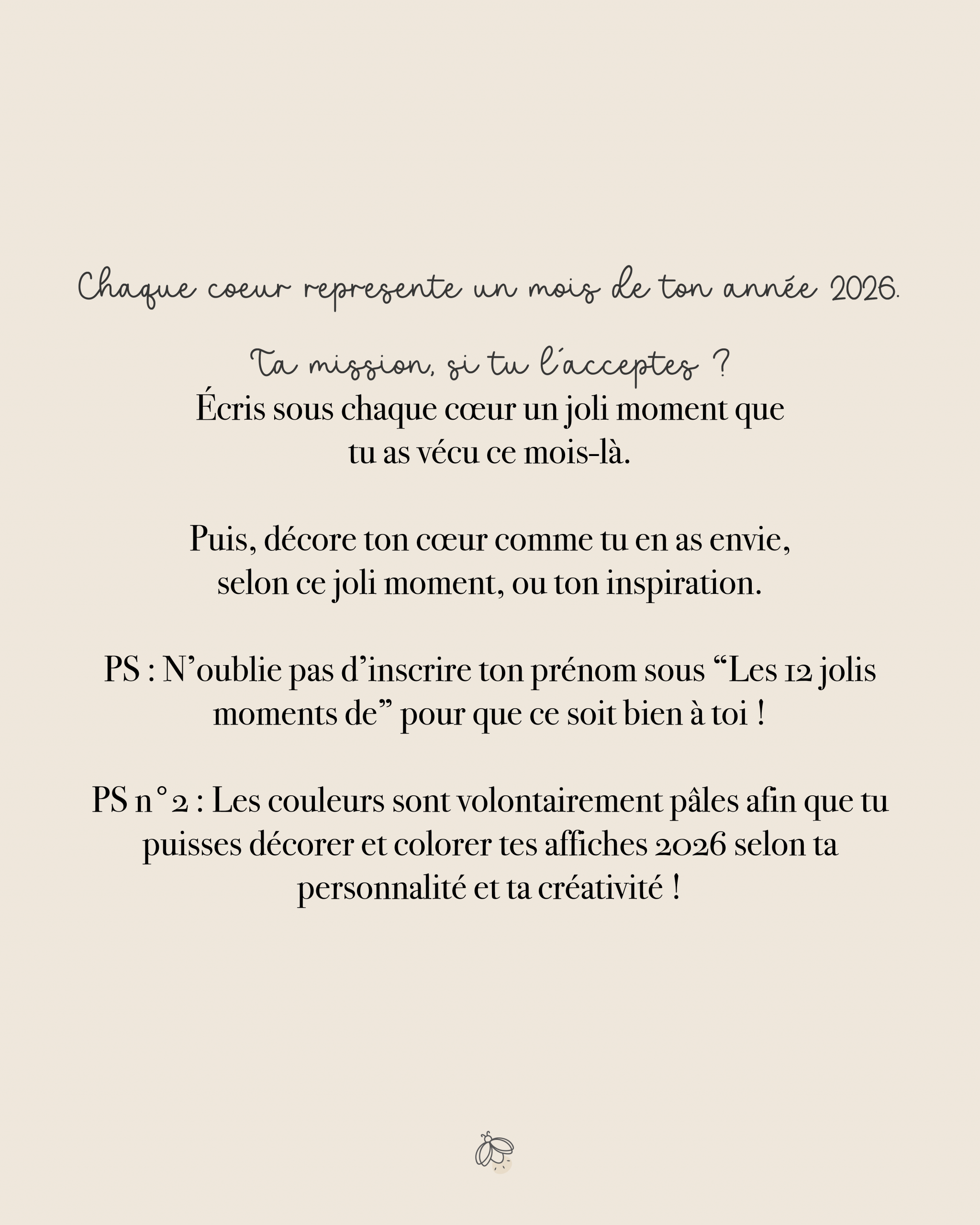 C’est simple, un coeur correspond à un mois de ton année 2026 ! Ta mission si tu l’acceptes, c’est tout simplement d’écrire sous chaque coeur un joli moment que tu auras vécu le mois correspondand. Tu pourras alors ensuite décorer ton coeur en fonction de tes envies ou de ton joli moment.