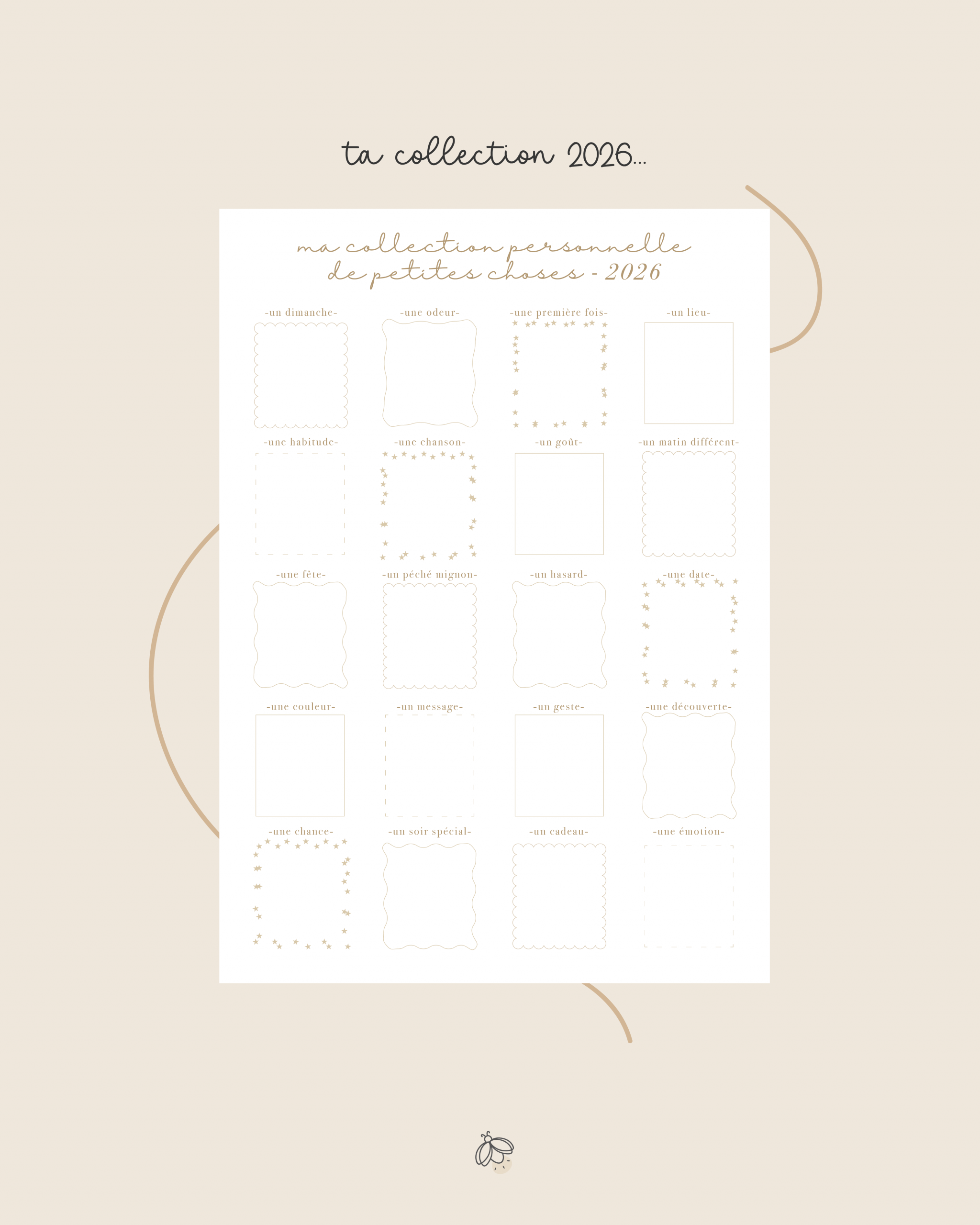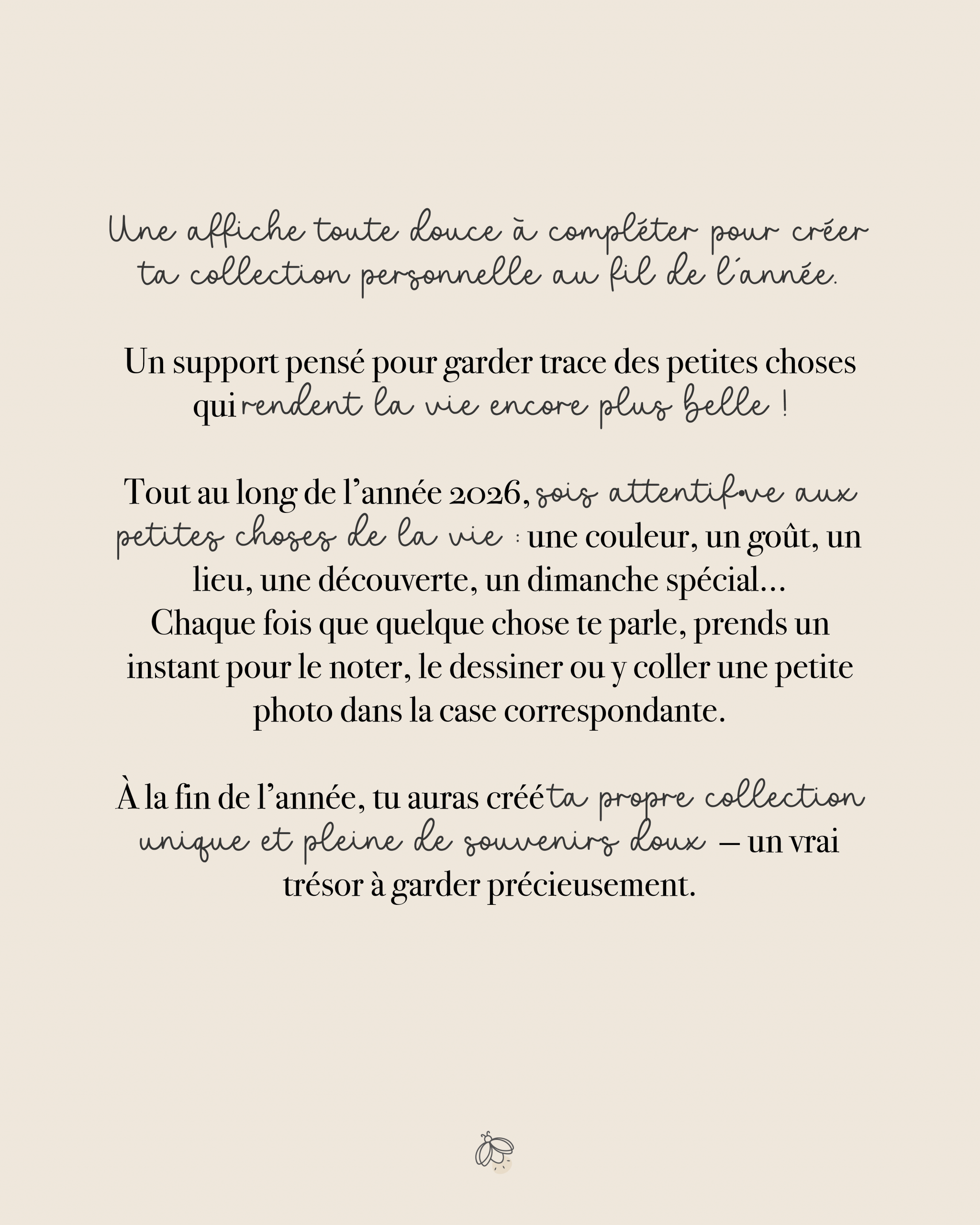 Une affiche douce à compléter tout au long de l’année, pour garder trace des petites choses qui rendent la vie encore plus belle. Prends connaissance de chacune des cases dès le début de l’année, ainsi tu pourras t’imprégner de ta future collection !