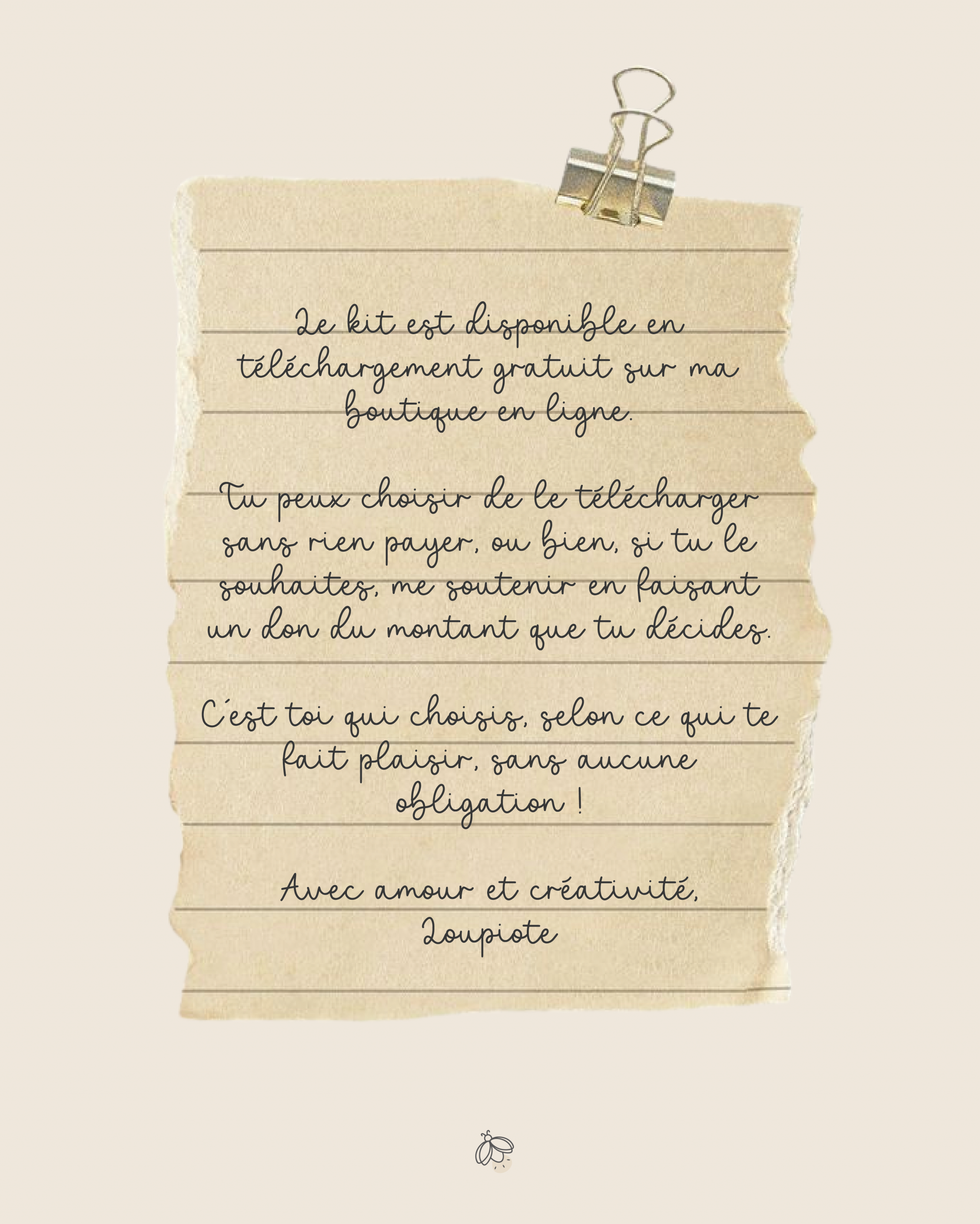 Ce kit est proposé en téléchargement libre, tu peux choisir le montant que tu souhaites pour soutenir Loupiote Créatrice.